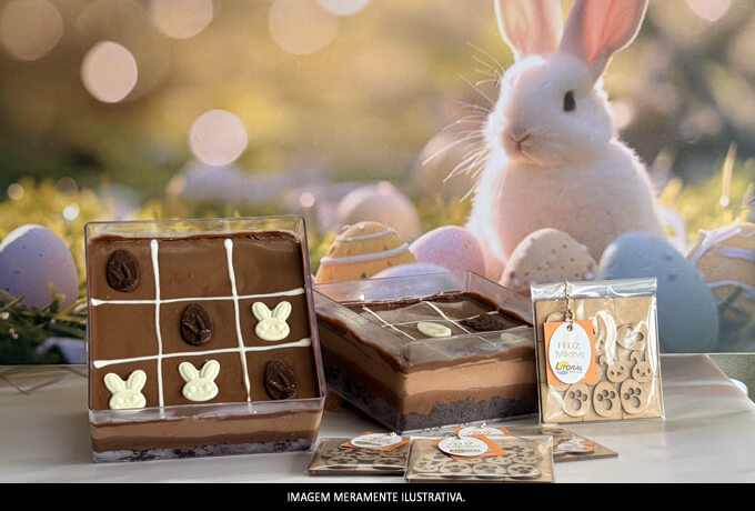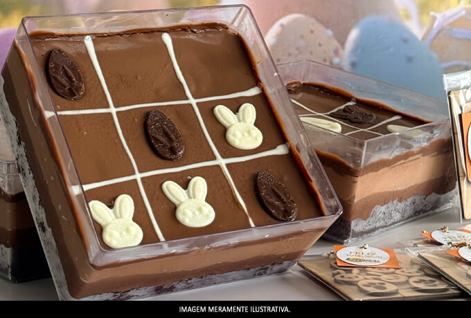Além de ser uma explosão de chocolate em cada pedaço, o grande destaque fica por conta da decoração lúdica em formato de jogo da velha com coelhinhos, tornando essa torta uma escolha ideal para presentear, celebrar ou simplesmente surpreender.
